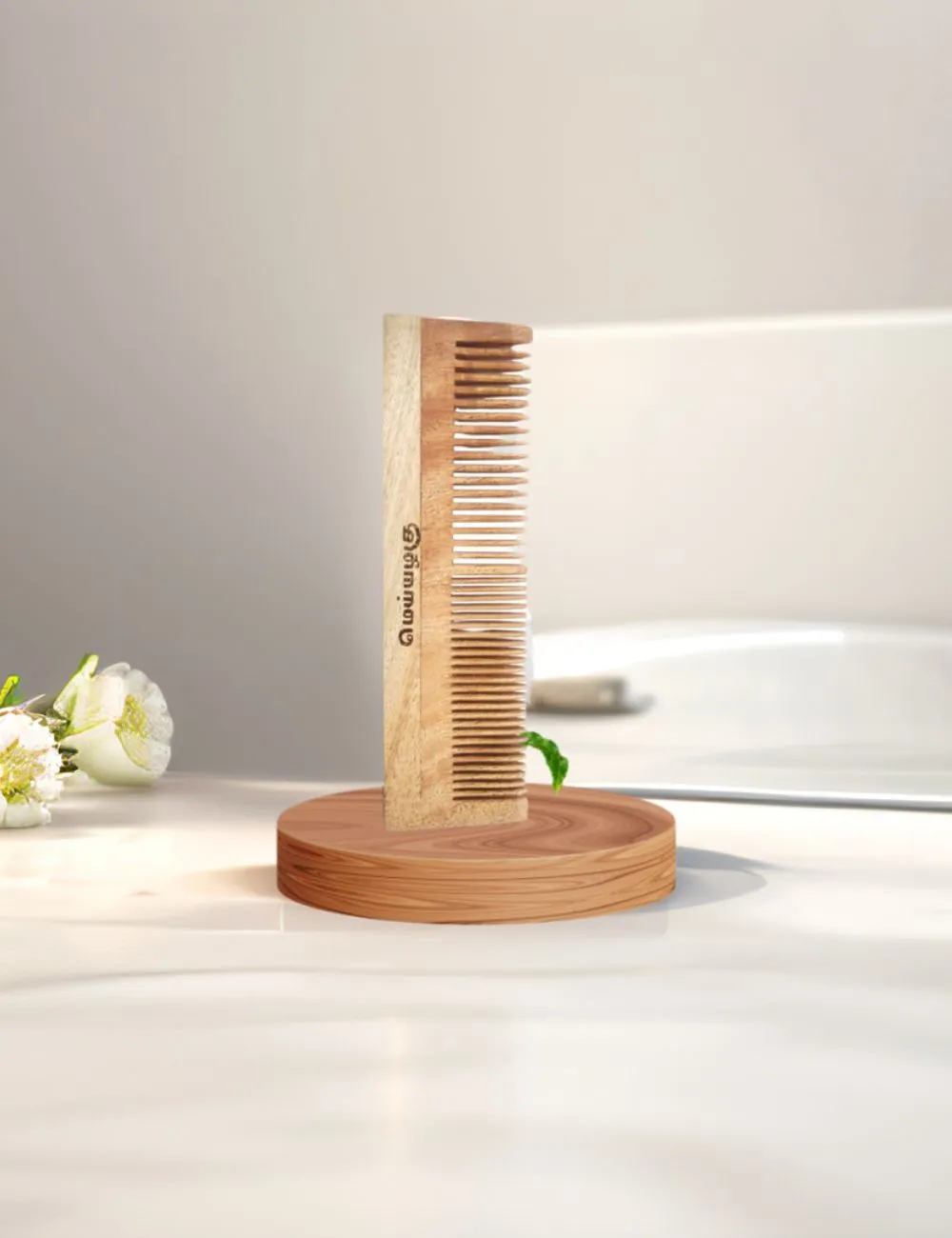 This neem comb is a natural, eco-friendly haircare tool made from neem wood, known for its antibacterial and antifungal properties. It helps maintain scalp health while gently detangling hair.